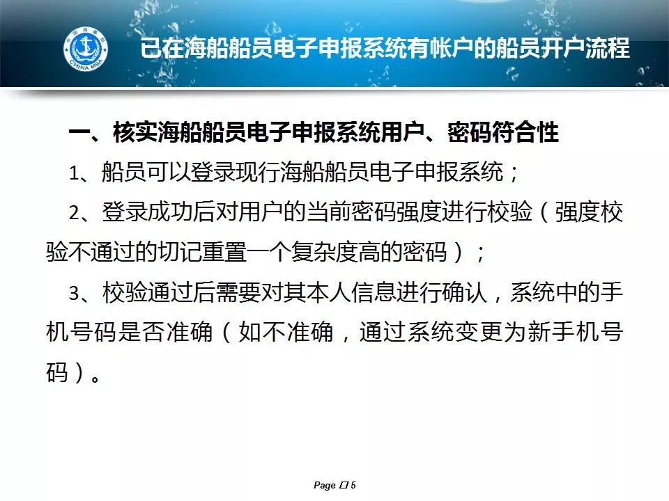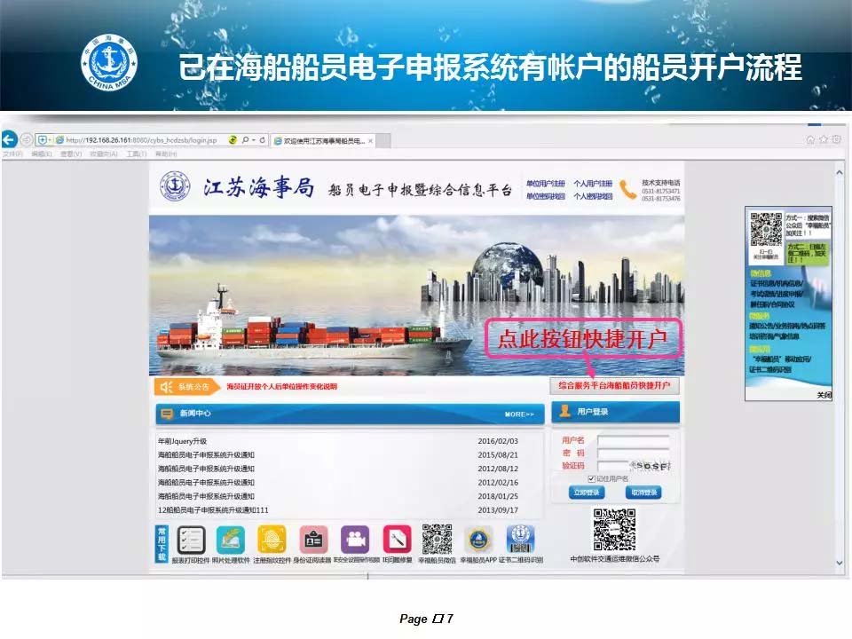 船員電子申報系統(tǒng)已正式啟用新系統(tǒng),那么該如何成為新用戶呢? 趕緊看看下方↓的個人開戶說明。 老系統(tǒng)已有賬號的同學(xué)請看向這里,進(jìn)入老系統(tǒng)更新自己手機(jī)號碼→退出老系統(tǒng)登錄界面→點擊快捷開戶。(注意:新人或是老系統(tǒng)忘記密碼無法在老系統(tǒng)更新自己手機(jī)號碼的,只能到海事局現(xiàn)場采集開戶。)